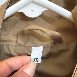 Stylish tan cropped utility jacket with button details. Features large front pockets and a zip closure.
