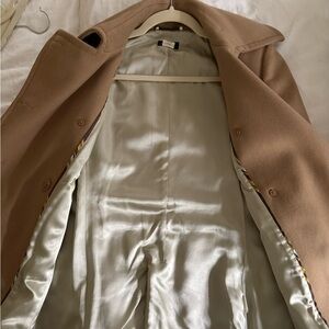 Stylish tan double-breasted peacoat. Features classic button details and a wide collar. Silk lining. Pockets. Only dry cleaned. Pretty camel color, iconic wool Jcrew coat.