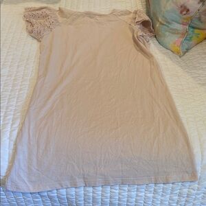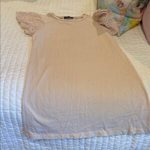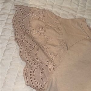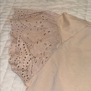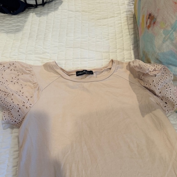 Chic blouse with eyelet puff sleeves. Soft blush color. Ideal for casual elegance.