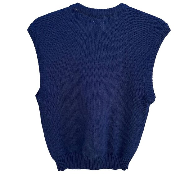 This sleeveless sweater vest features a classic navy blue knit design, accented by functional button details on the shoulder. Crafted from an acrylic and wool blend, this medium-sized garment is both lightweight and warm, offering versatile layering options for a polished look.
