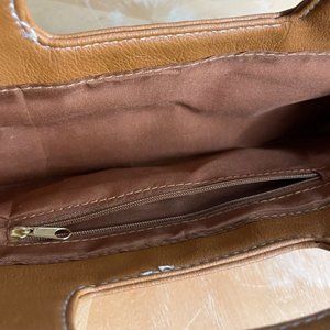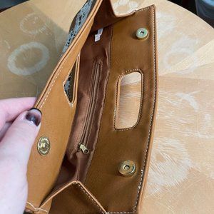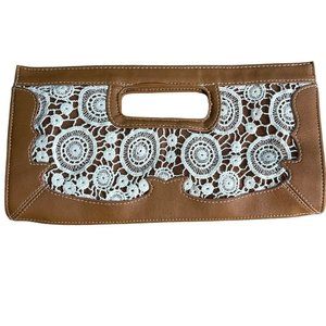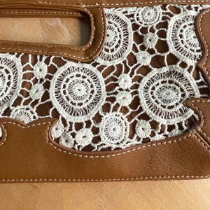 Tan Faux Leather Cream/White Lace Doilies Clutch Handbag Zipper 2 Button Close
