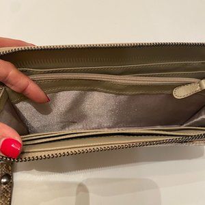 Tan Faux Snake Skin Clutch, with wallet pockets for credit cards and zipper pouch inside. removable wrist strap. lightly used in good condition.