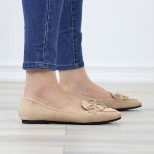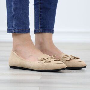 Tan Faux Suede Pointed Toe No Heel Flat Bow Tassel Decor Slip On Loafers Shoe