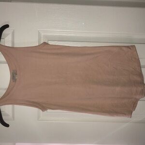 This fitted tank top in a soft tan hue features a classic sleeveless design with a scoop neckline and thin straps. Its lightweight fabric offers a comfortable and stylish fit, perfect for layering or wearing on its own.