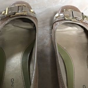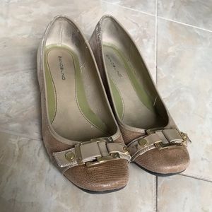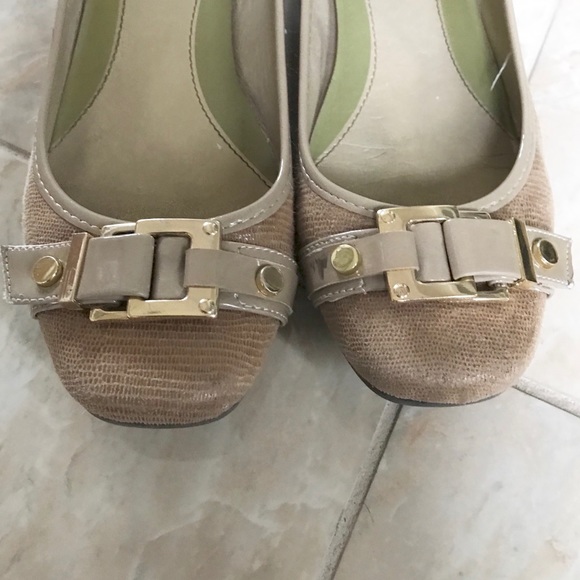 Tan flats with gold buckle. Definite wear on inside of shoe. Please see pictures for wear.
