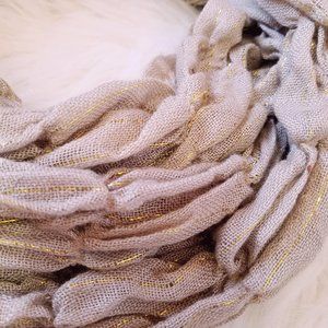 Lovely Tan Ruched Infinity Scarf with Metallic Gold throughout it.