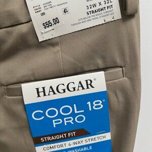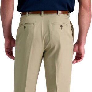 Timeless and versatile Haggar khaki dress pants featuring 4-way stretch for ultimate comfort, moisture wicking technology, UV protection, and are wrinkle resistant. Classic pleated front, straight leg, and crisp crease for a polished look. Includes shirt-gripping technology. Perfect for the office, golf course, or casual events. Machine-washable, no iron necessary.