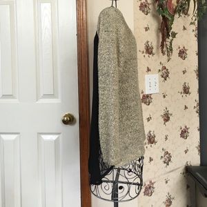 Hi-Low Tan scope neck sweater with black trim at neckline. Black sheer back! Open weave type sweater fabric. Sleeves are 22" from shoulder! Never worn