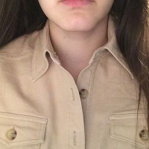 Tan Jacket Dress. True to Size. No Belt. Button at Neck Missing. Thick but Flexible Fabric.