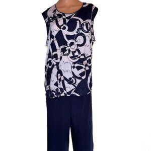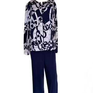 Pants: Size 12, Elastic Waist 34", unstretched. Inseam: 28 1/2" Wide leg, Stretch 92% Polyester, 8% Spandex Machine Wash