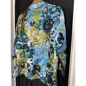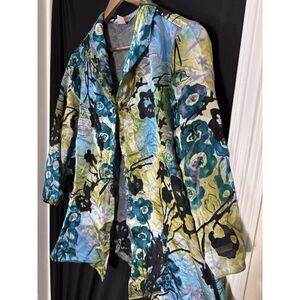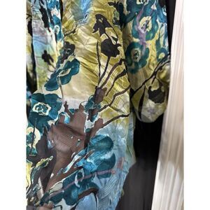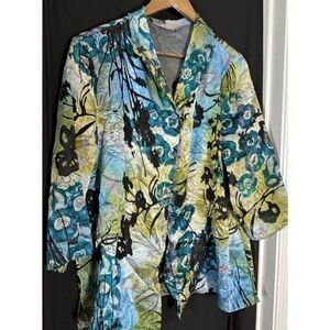 This is a Tan Jay shacket in size 18 Plus, featuring a dark floral burn out velvet design with 3/4 sleeves. It is a loose fit jacket suitable for an evening out during the spring season. The exterior color is black with multicolor floral accents and bead details, making it a stylish choice for women's fashion.