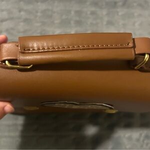 Chic backpack in tan leather. Features a heart emblem and gold hardware. Ideal for stylish outings. Not an LV bag, just has logo glued on for style