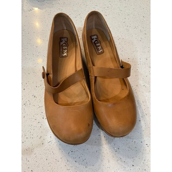 Tan, leather Korks by Kork-Ease Mary Janes. Have some wear (as shown in photos) but still have lots of life left! Giving Y2K vibes