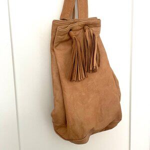 Keywords: tan leather, carry on bag, boho, festival, tassels, 70s, book bag