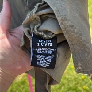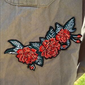 This tan lightweight shirt jacket combines a utilitarian design with decorative embroidered butterfly patches for a unique look. Made from a cotton-blend material, it offers a structured yet casual style perfect for layering. The butterfly embellishments add a touch of whimsy to this versatile piece.