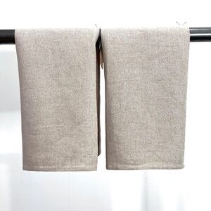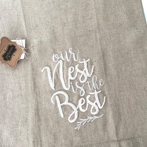 Mud Pie Linen French Knot Guest Hand Towel Set of 2 towels Cotton Linen with hand knotted French knot sentiment and embroidered stem leaf approx 20” x 14” unfolded Natural beige flax linen tan khaki white linen hemstitch fingertip towel"Our Nest Is Best" " Welcome to our Nest" embroidery