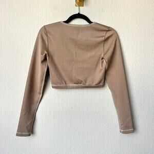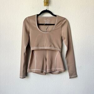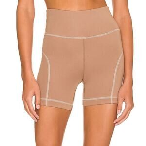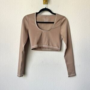 Tan + Lines 'La Jolla' long sleeve sports bra top and 'Del Mar' biker shorts in Latte tan. Long sleeve bra top is a size medium, Biker shorts are a size small. Contrast stitching on both. Can sell separately if desired, please message me. In excellent condition.