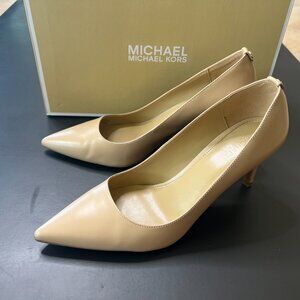 Lightly worn, excellent condition. A subtle scuff on the front (see photo) — otherwise in beautiful shape. These timeless nude/tan Michael Kors heels are the perfect neutral for business meetings, special occasions, or everyday elegance.