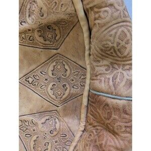 This handmade Moroccan leather pouf form ottoman footstool is a stylish and unique addition to any living room. The round shape, tan color, and embossed mandala pattern add a touch of exotic flair to the room. The ottoman is designed for maximum weight capacity of 40 lbs, making it sturdy and versatile for adults to use. Crafted from genuine leather with a Moroccan style, this fully assembled piece is both functional and decorative, perfect for adding a cozy spot to relax in your home.