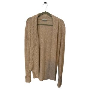 This tan cardigan features a soft, textured knit with a relaxed open-front design, ideal for layering. Its long sleeves and medium-weight fabric provide everyday comfort and style.