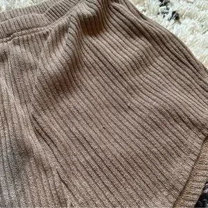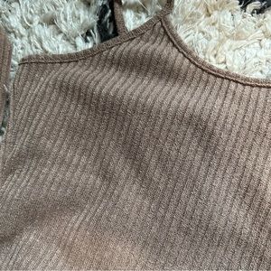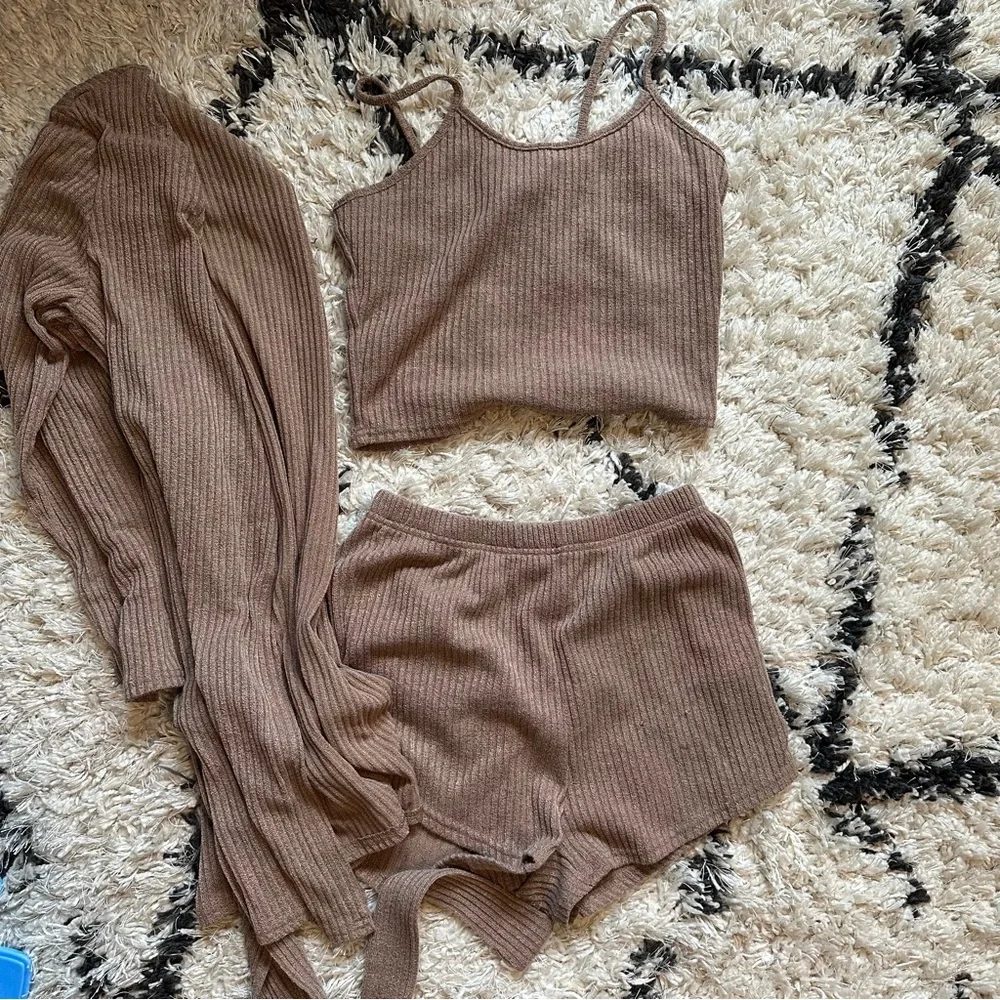 Tan PJ Set with matching robe. Ribbed material. Crop tank, shorts and robe. From Amazon, size Small. Two small pulls in fabric on the shorts, shown in last photo.