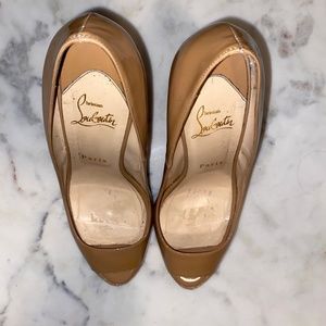 Tan patent leather Christian Louboutin peep toe heels size 39 in good condition, slight wear makings, I resoled the bottoms at the New York Leather Spa. Beautiful classic style. No Box, sold as is.