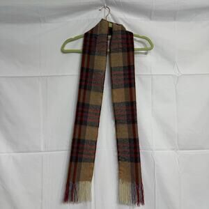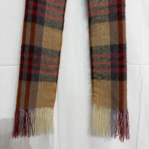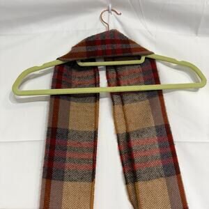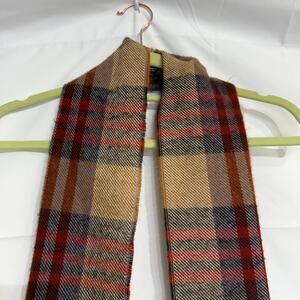 Tan, ivory, red, blue and black plaid scarf in excellent preowned condition.