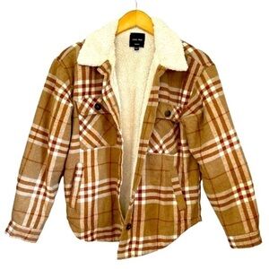 Tan Plaid Shacket with Sherpa Lining and Collar Satin lining in sleeves Size Medium