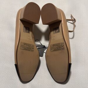 This is brand new with tags. The color is tan with black toe. All man-made. The hardware is silver. 2.25 inch block heel. Adjustable stretch buckle. Medium width.