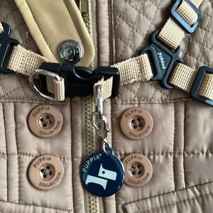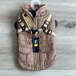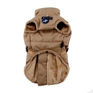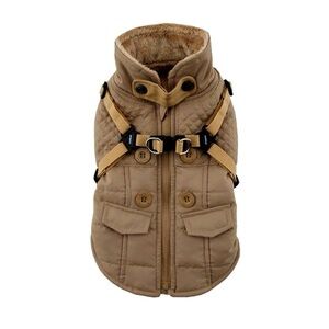 Stylish tan quilted dog jacket. Features built-in harness and button details. Perfect for keeping your pet warm and fashionable.