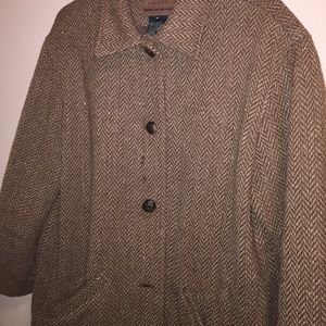 Button down tan coat. Tortoise shell buttons. Very warm and cozy. Can be worn with a variety of styles. Dress it up or down. This style of coat is timeless and can be worn for years to come.