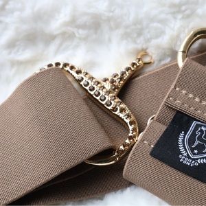 These 2” wide heavy-duty snaffle bit belts are blinged-out with rhinestones for a fun yet classy look. This belt is tan and can come with a silver or gold buckle. You don’t have to be an equestrian to rock this!