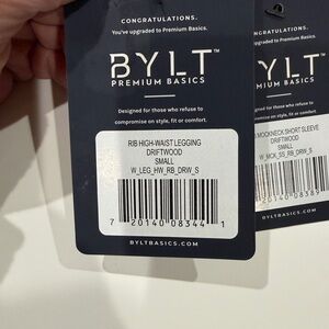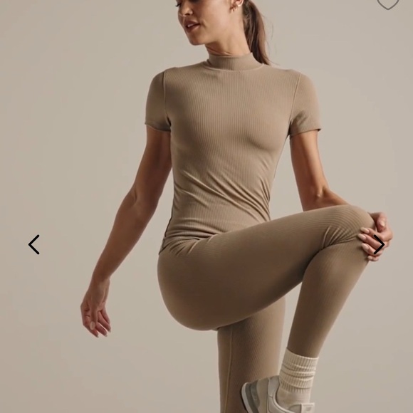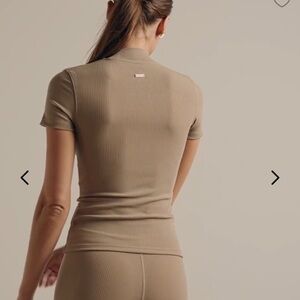 Stylish tan ribbed activewear set. Includes short-sleeve top and leggings.