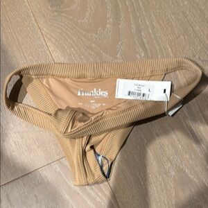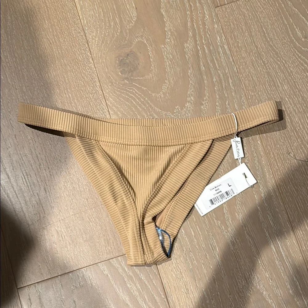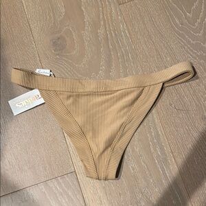 Stylish tan ribbed bikini bottom. Perfect for beach days. Brand new with tags. Plastic liner still intact. Size large but runs very small, would consider a size XS