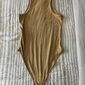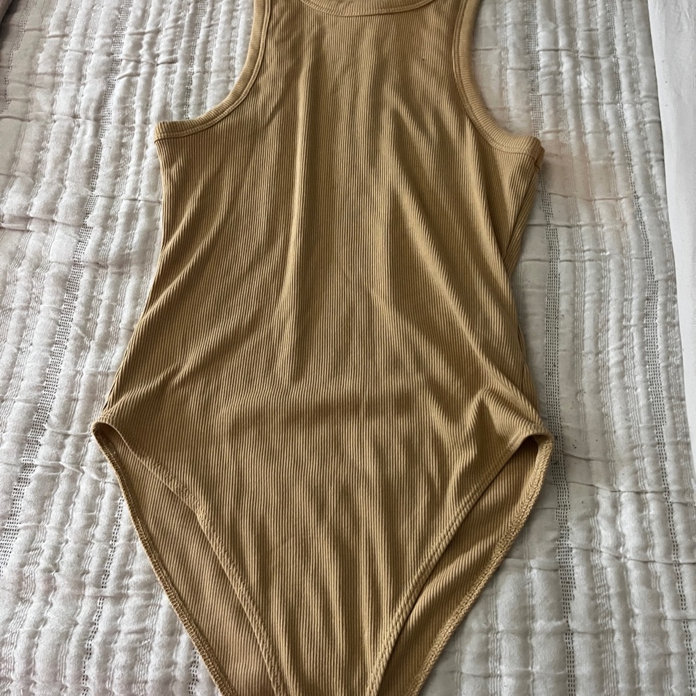 Stylish tan ribbed bodysuit. Perfect for layering or wearing alone.