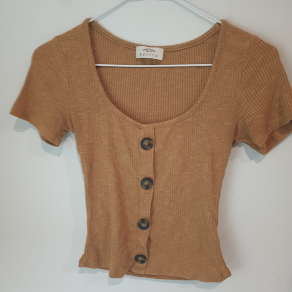 Elevate your style with the tan ribbed button-down top. Perfect for versatile, everyday wear.