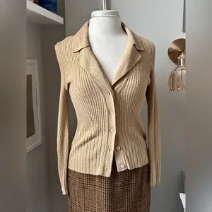Stylish tan ribbed cardigan with button-up front. Perfect for layering.