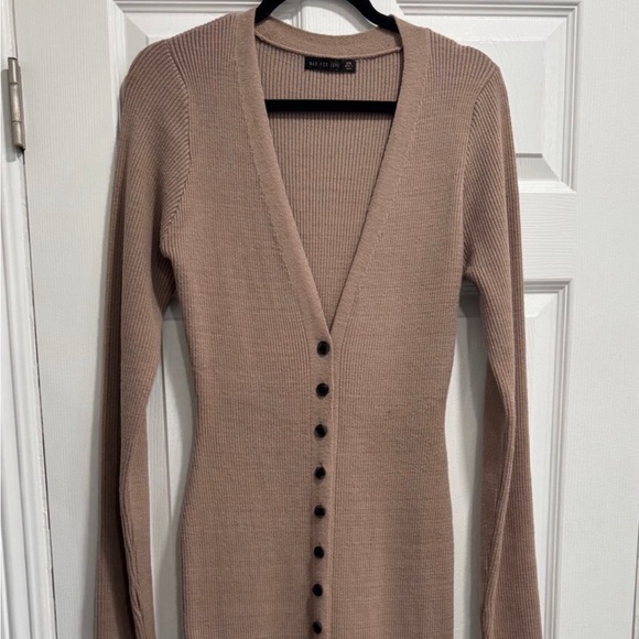 Elevate your style with this elegant tan ribbed dress. Featuring a button-up front, it's perfect for any occasion.