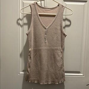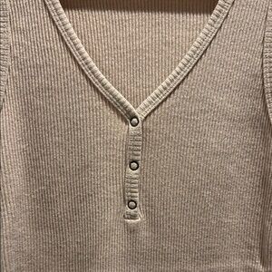 This beige tank top features a ribbed texture and a buttoned front, offering a stylish and versatile addition to your wardrobe. Its sleeveless design makes it perfect for warm weather or layering under jackets and cardigans. The soft fabric ensures comfort throughout the day. NWOT