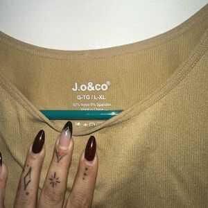 tan ribbed crop tank with a high neckline. Soft stretch fabric for comfortable all-day wear. Versatile piece that layers easily and pairs well with jeans or skirts.
