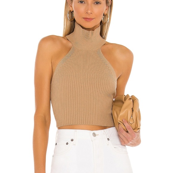 Elevate your style with this chic tan ribbed halter neck top. Perfect for any occasion, this top offers a sleek and modern look. Worn once from revolve. Super cute sweater like material.