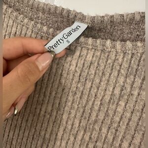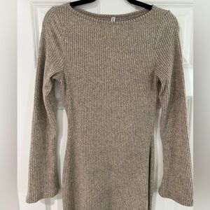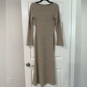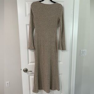 This soft tan ribbed knit dress offers a sophisticated look for any occasion. Its long sleeves and comfortable fit make it a versatile addition to your wardrobe. Worn and washed only 1x