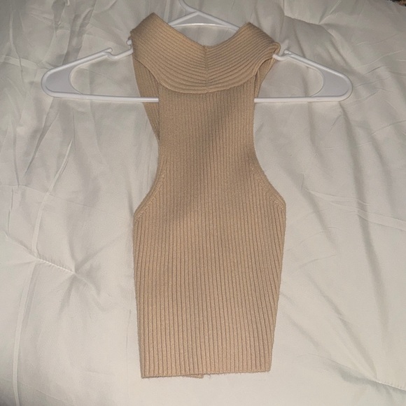 Stylish tan ribbed knit halter top. Perfect for casual outings.