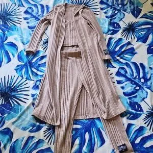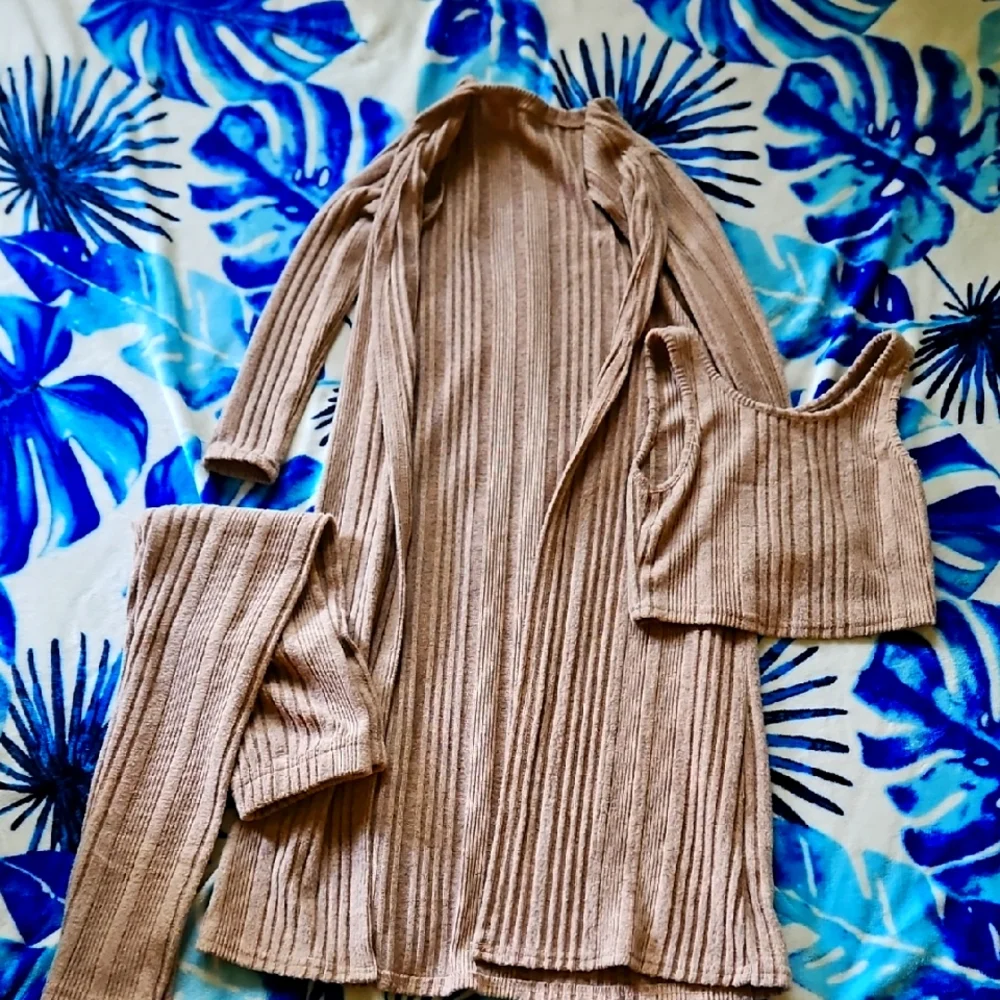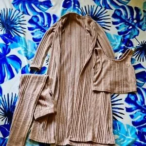 Stylish tan ribbed knit set. Includes a long cardigan, crop top, and pants. Perfect for a cozy and chic look.