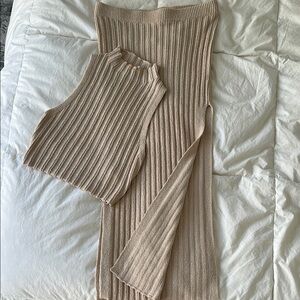 Stylish sand ribbed knit two-piece set. Includes a sleeveless crop top and matching skirt with slits. Super lightweight and stretchy. The perfect summer essential! Size small, lightly worn.