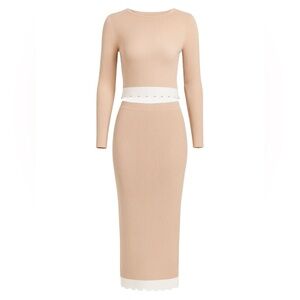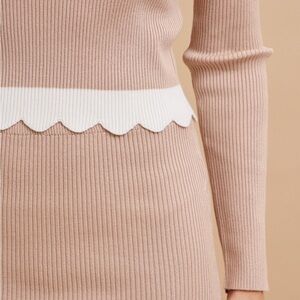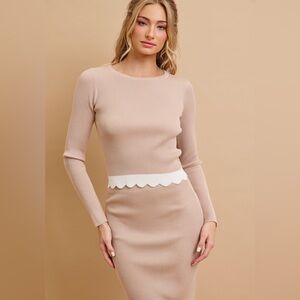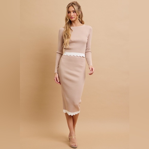 Effortlessly chic and ultra-flattering, this boutique ribbed knit two-piece set is the perfect blend of cozy and sophisticated. Designed in a luxe neutral beige with feminine scallop trim, this matching long sleeve top and midi skirt creates a sleek, polished silhouette that hugs in all the right places.