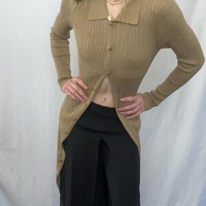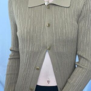 Stylish tan ribbed long cardigan. Features button-down front and collared neckline.