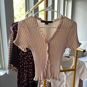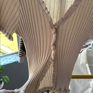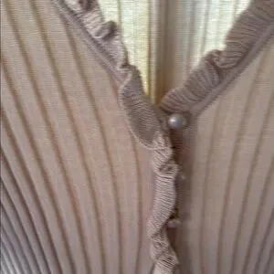 This sweater in a versatile tan hue features a ribbed texture and elegant ruffled details. The buttoned front adds a touch of sophistication, making it a perfect choice for both casual and formal occasions. Open in front to expose the belly. Super cute. Never worn.