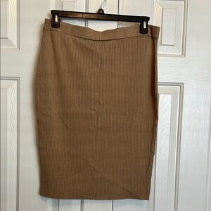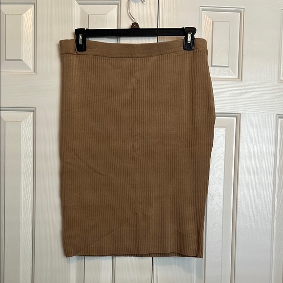 Elevate your wardrobe with this stylish tan ribbed skirt. Perfect for any occasion, this versatile piece is a must-have. Soft knit fabric. Not see thru. Great used condition. Midi length.