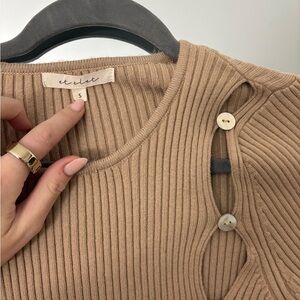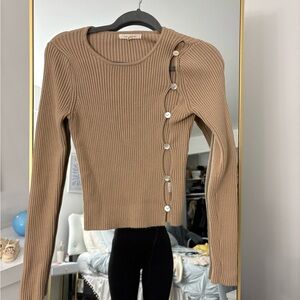 Stylish tan ribbed sweater featuring unique button detail on the side. Perfect for a chic look.